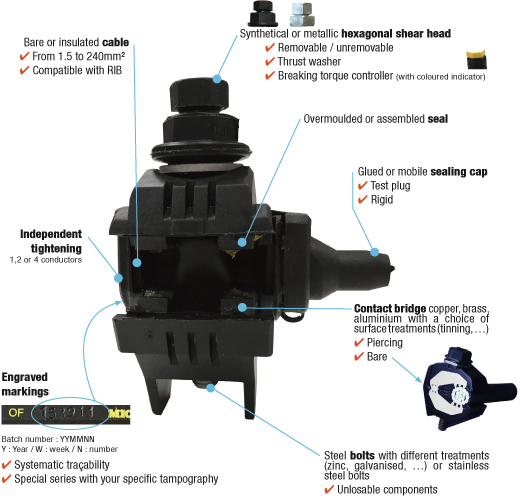 Đầu nối này được thiết kế để kết nối các dây cáp, cách điện với điện áp thấp A.B.C. (Đường dây dẫn điện trên không).